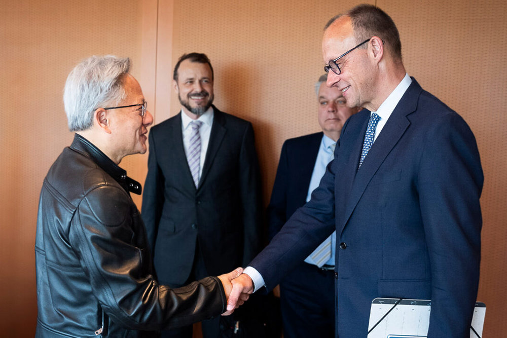 지난 6월 13일, 젠슨 황 엔비디아 CEO와 프리드리히 메르츠 독일 총리가 프랑스 파리에서 만나 데이터센터용 GPU 납품과 관련된 계약을 맺었다 / 출처=엔비디아