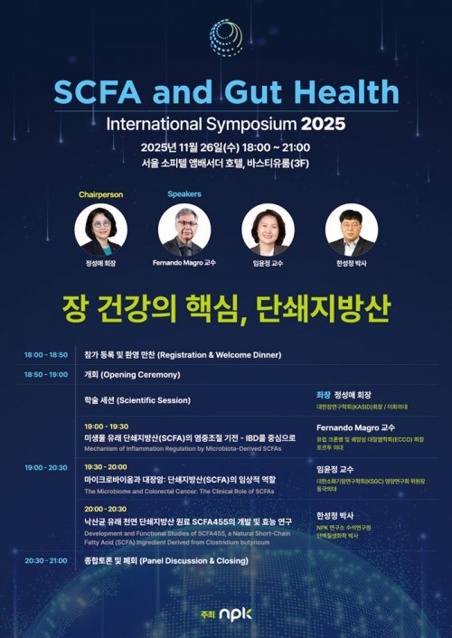 이번 행사를 주관한 엔피케이는 천연 발효 공정을 기반으로 한 자사 독자 기술 SCFA455를 중심으로 포스트바이오틱스 산업화 연구를 진행하고 있다. 엔피케이는 “해외 석학 초빙을 통해 국내 학계-산업계 협력 모델을 구축하고, SCFA 기반 글로벌 기능성 원료 시장에서 기술 리더십을 강화하겠다”고 덧붙였다.