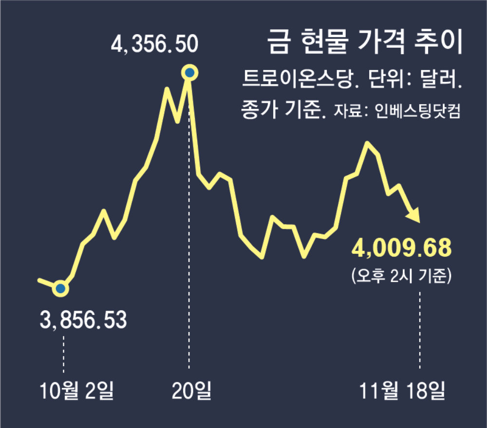 올해 뜨거운 상승세를 보였던 금과 은 가격도 여지없이 추락했다. 금융 정보 플랫폼 인베스팅닷컴에 따르면 금 현물은 18일 트로이온스당(약 31.1g) 4000달러 선에서, 은 현물은 49달러 선에서 거래됐다. 금은 지난달 4300달러, 은은 54달러 선까지 치솟으며 품귀 현상까지 벌어진 바 있다.