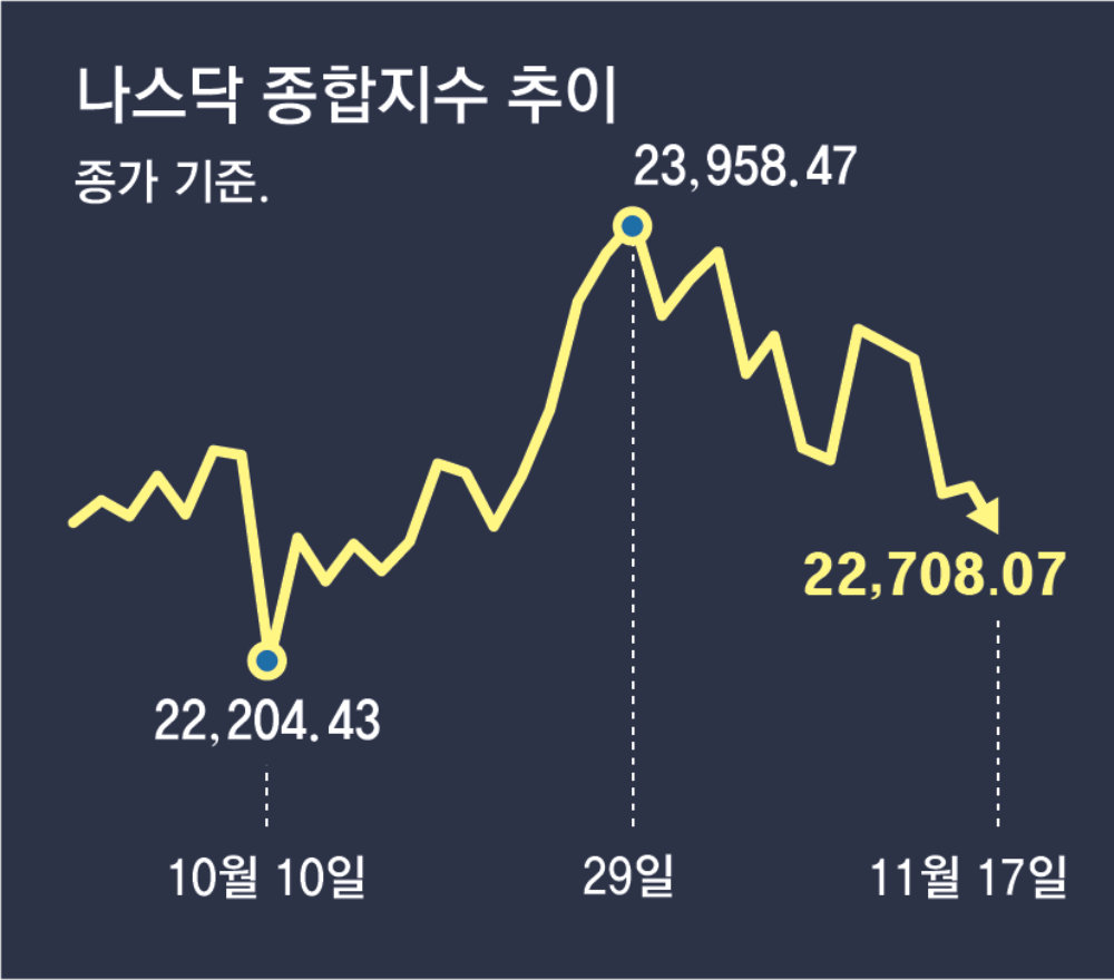 ‘에브리싱 셀오프’는 조정 국면일 뿐 오래가지는 않을 것이란 분석도 있다. 문남중 대신증권 연구원은 “10월에 미 증시가 사상 최고치를 경신한 데 따른 자연스러운 주가 조정”이라며 “엔비디아 실적과 미국 고용지표 발표 뒤 ‘안도 랠리’가 이어질 수 있다”고 내다봤다.