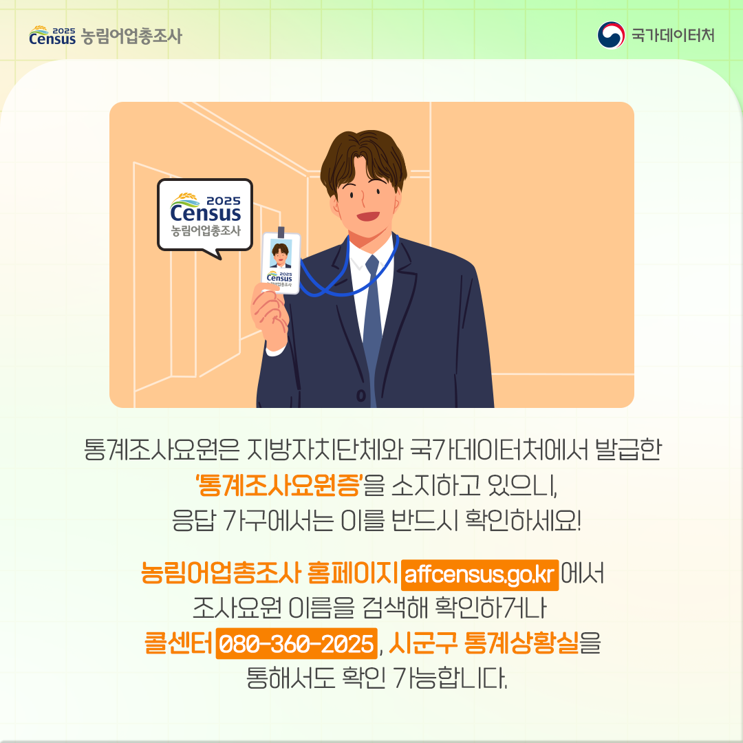 농림어업총조사 홈페이지(affcensus.go.kr)에서 조사요원 이름을 검색해 확인하거나 콜센터(080-360-2025), 시군구 통계상황실을 통해서도 확인할 수 있다.