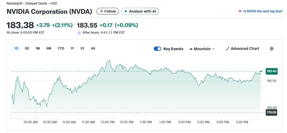 4일(현지 시각) 뉴욕증시에서 엔비디아는 2.11% 급등한 183.38달러를 기록했다. 이로써 시총도 4조4650억달러로 늘었다.