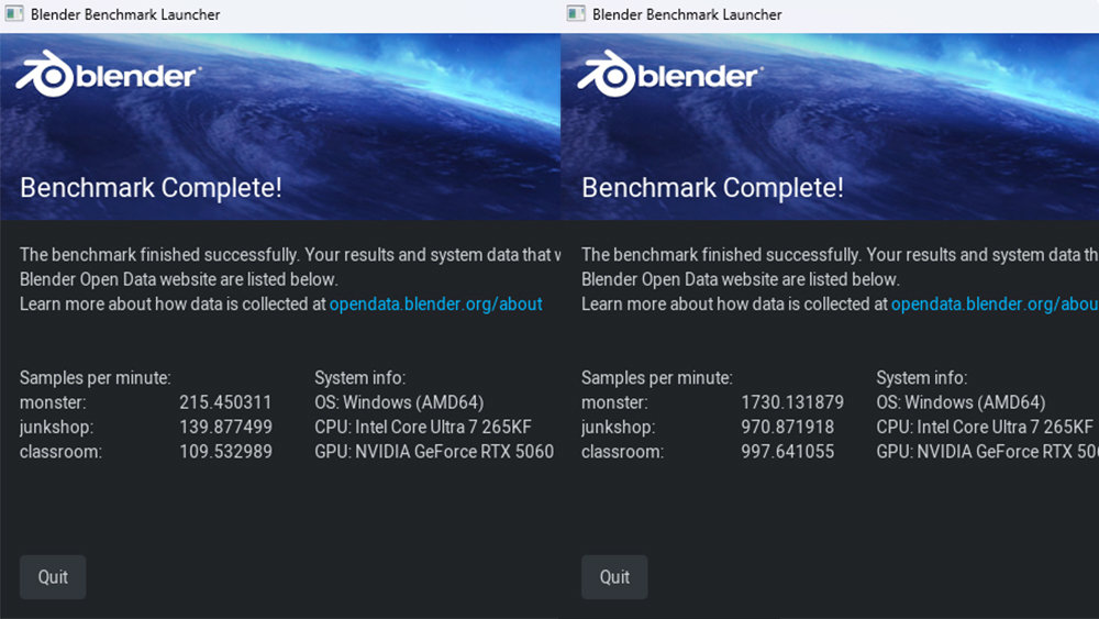 3D 렌더링 프로그램인 블렌더의 성능을 수치로 확인하는 블렌더 4.5 벤치마크 테스트 결과. 좌측이 CPU, 우측이 그래픽 카드 성능이다 / 출처=IT동아