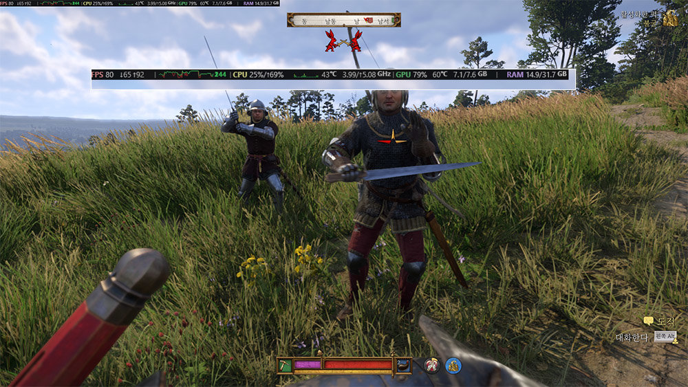 현존 최고사양인 킹덤컴: 딜리버런스 II는 FHD 기준 65프레임이었다 / 출처=IT동아킹덤컴: 딜리버런스 II의 권장 사양은 인텔 코어 i7-13700K 및 32GB 메모리, 엔비디아 RTX 4070으로 가장 높다. RTX 5060은 권장사양에 미치지 못하지만 FHD 조건이라면 할만하다. FHD 해상도 울트라 옵션으로 설정했을 때는 최소 65프레임에서 최대 92프레임 정도를 확보했고, 같은 조건으로 2560X1440p로 설정하면 45프레임 정도까지 떨어진다. CPU를 그대로 유지하고 RTX 5080 급의 그래픽 카드를 사용하면 검은 신화: 오공 4K 레이 트레이싱, 사이버펑크 2077 패스 트레이싱 모드 등도 원활히 즐길 수 있다.