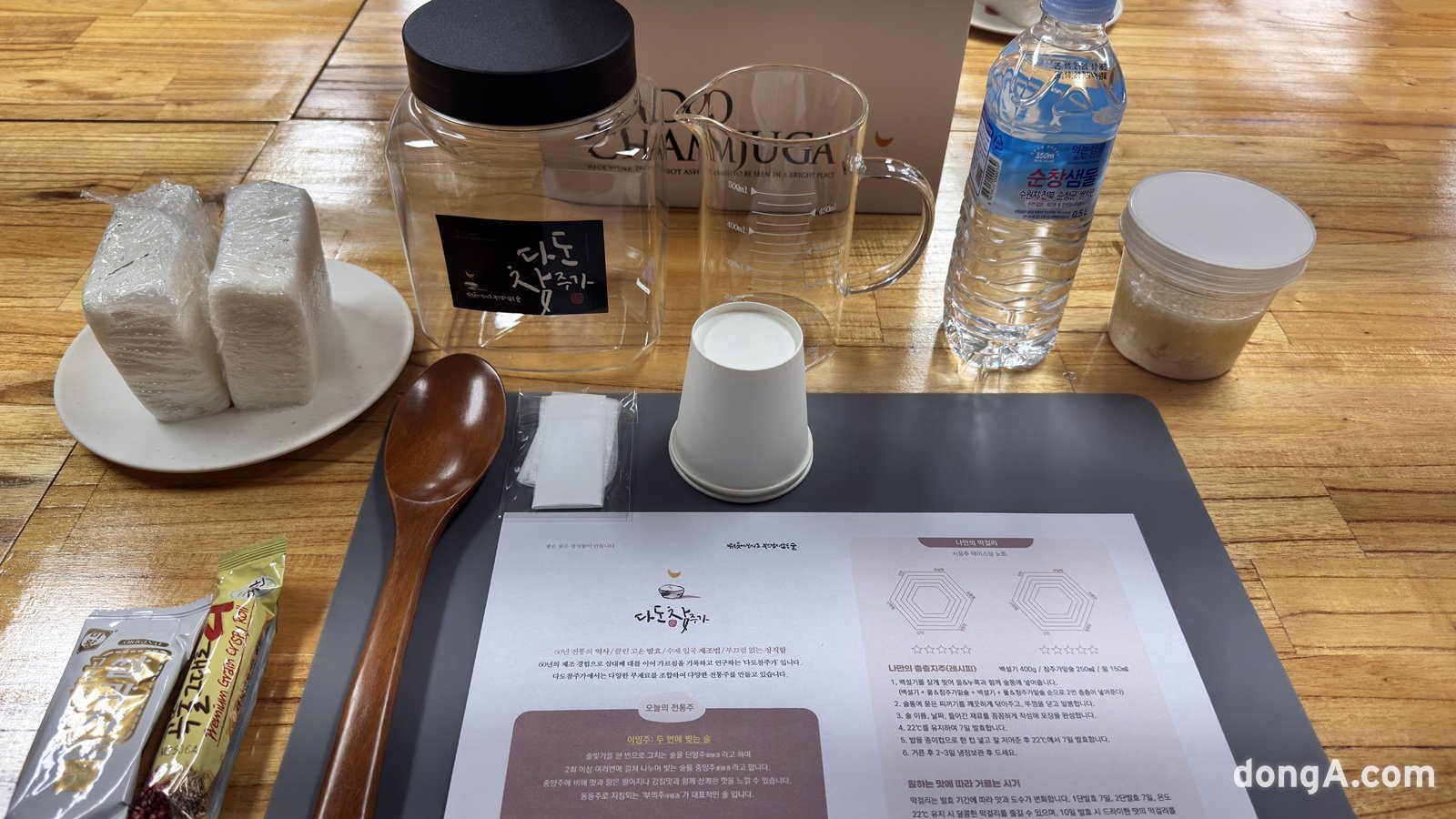 찾아가는 양조장인 다도참주가에선 막걸리 빚기 체험을 경험할 수 있다. 윤우열 기자 cloudancer@donga.com체험 과정은 간단하다. 백설기를 잘게 찢어 물, 누룩과 함께 술통에 넣는 과정을 층층이 두 번에 걸쳐 하면 끝이 난다. 발효가 잘 이뤄질 수 있도록 재료들을 잘 혼합하는 것이 핵심이다. 이후엔 22도를 유지해 7일 발효하고, 이후 밥을 종이컵 한 컵 넣고 저은 후 22도에서 또 다시 7일 발효하면 된다. 완성된 결과물을 거름망에 거른 후 2~3일 냉장보관하면 마실 수 있는 맛있는 술이 된다.