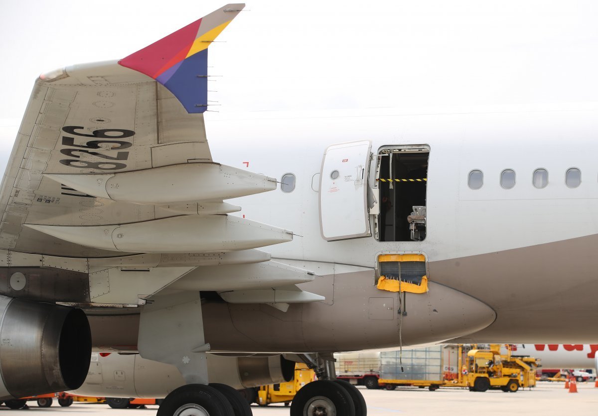 지난 2023년 발생한 아시아나항공 비상구 개방 사고 항공기. 뉴스1대한항공에 따르면 최근 2년간 비상구를 조작하거나 조작을 시도한 사례는 14건에 달한다. 대한항공 측은 “항공기 비상구 도어를 조작하거나 조작을 시도하는 행위는 항공기 운항을 방해하고 모든 승객의 안전을 심각하게 위협하는 명백한 범법행위”라며 “항공보안법 제23조(승객의 협조의무) 제2항에 따르면 승객은 항공기 내에서 출입문, 탈출구, 기기 등을 조작해선 안 된다고 명시하고 있다”고 강조했다.