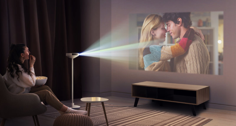 긴 스탠드에 원형의 프로젝터 헤드를 결합한 형태로, 자유롭게 옮겨 다니며 최대 120인치 대화면으로 다양한 콘텐츠를 감상할 수 있다.