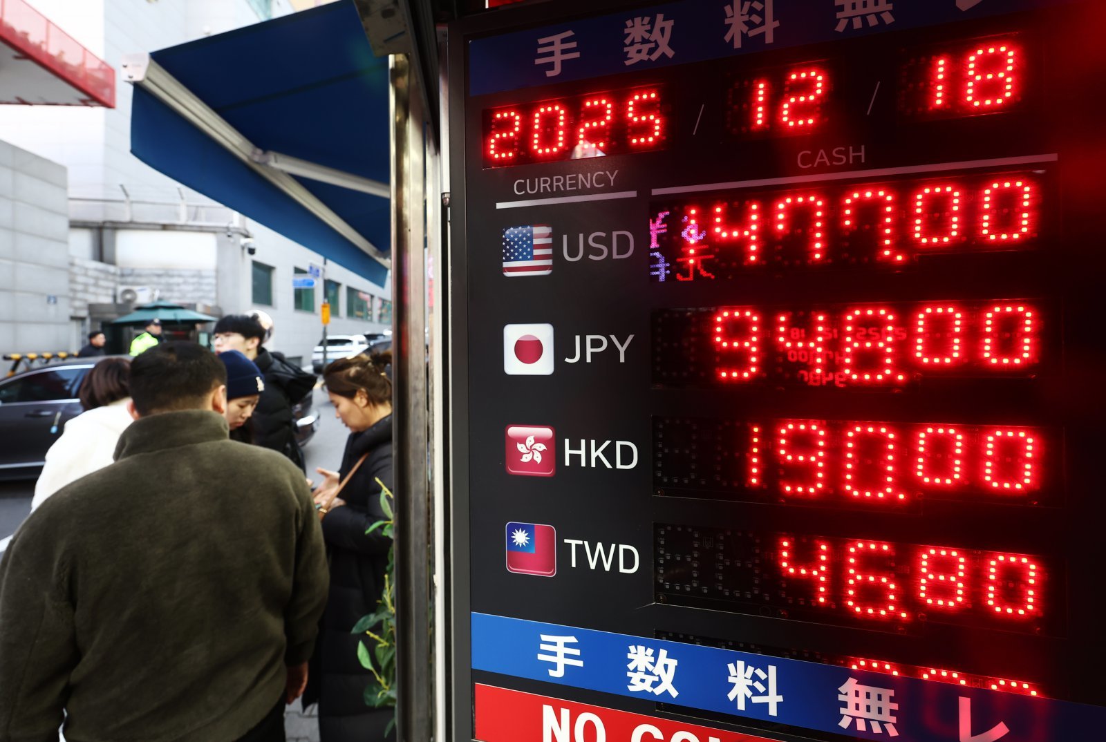 원·달러 환율이 연일 고공행진 하고 있는 18일 오전 서울 시내의 환전소에서 외국인 관광객들이 환전을 하고 있다. 전날 원·달러 환율은 8개월 만에 장중 1480원을 돌파했다. 2025.12.18 뉴스118일 서울 외환시장에서 원-달러 환율은 1478.3원으로 주간 거래를 마쳤다. 전날 대비 1.5원 하락(원화 가치는 상승)하긴 했지만 여전히 높은 수준을 유지했다. 전날에는 장중 1480원대까지 치솟기도 하며 12월(1~18일) 월간 평균 환율은 1472.2원으로 나타났다. 외환위기 시기였던 1998년 3월(1488.87원) 이후 27년 9개월 만에 가장 높은 수준이다.