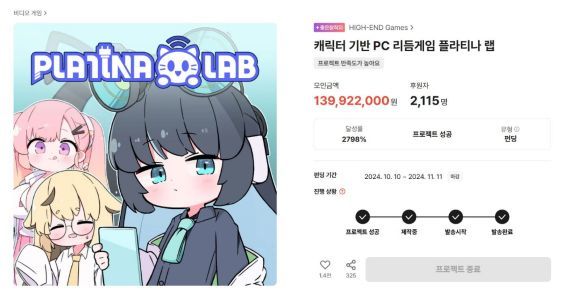 틈새 강자로는 리듬게임이 있었는데요. 캐릭터 기반 PC 리듬게임 ‘플라티나 랩’은 후원자 2,115명이 참여해 약 1억 4천만 원을 달성했고, ‘칼파 PC 완전판’ 역시 1,738명의 후원으로 약 1억 3천만 원을 모았습니다. 비교적 대중성은 낮은 장르지만, 취향이 맞는 이용자들이 강한 결속력을 보여준 결과라고 할 수 있겠죠.