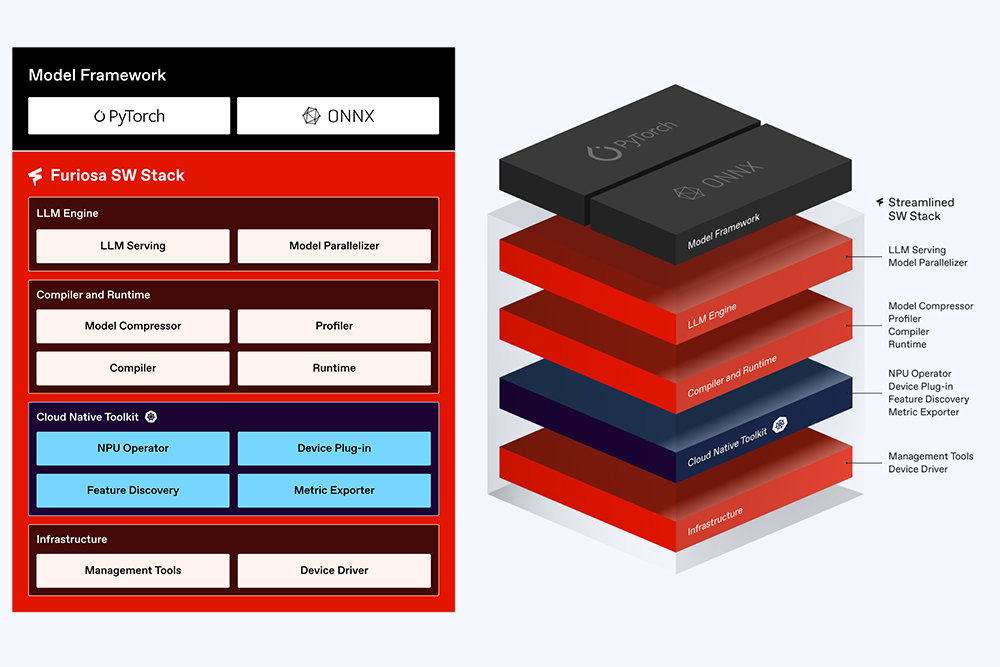 강지훈 CRO는 “RNGD의 데이터 흐름은 데이터를 세세하고 효율적으로 처리할 뿐만 아니라 소프트웨어 관리 측면에서도 용이하다. 파이토치에서 수행하는 고수준의 집약적인 연산을 바로 아키텍처에 매핑할 수 있고, 쉽게 성과를 확인할 수 있다. 결과적으로 퓨리오사AI는 LLM 서비스를 포함하는 자체적으로 구축한 소프트웨어 스택을 제공하고 있다”라고 말했다.