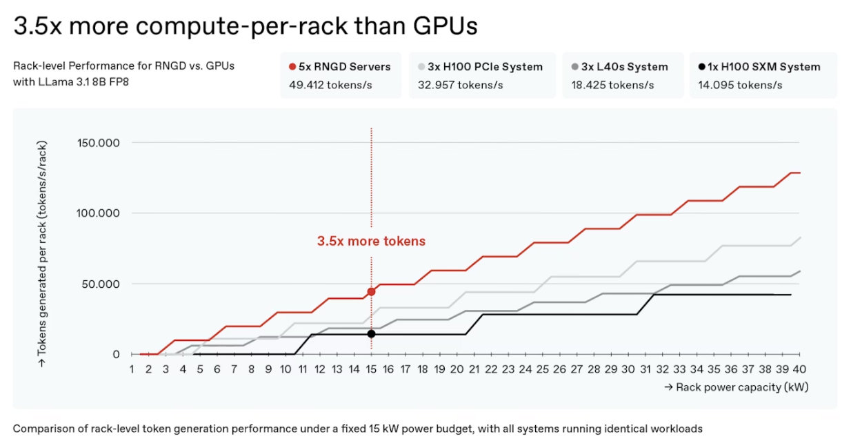 TCP의 기술적 정의 이후에는 내년 1월부터 2만 장의 RNGD 칩을 양산한다고 밝혔으며, 전력 효율에 대해서 한번 더 설명했다. 강지훈 CRO는 “최근 데이터센터에서 사용하는 렉은 평균 18kW 정도를 넘기 어려운데, 공랭식으로는 최대 출력이다. RNGD는 15kW 렉을 기준으로 엔비디아 H100 시스템보다 3.5배 높은 토큰을 생성할 수 있다”라면서, “전력 효율을 높이면 데이터 센터의 전력 밀도도 더 높일 수 있다. 차세대 제품은 180W인 열설계전력(TDP)보다 더 높은 400W급의 제품이 될 것”이라고 설명했다.