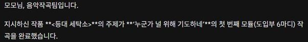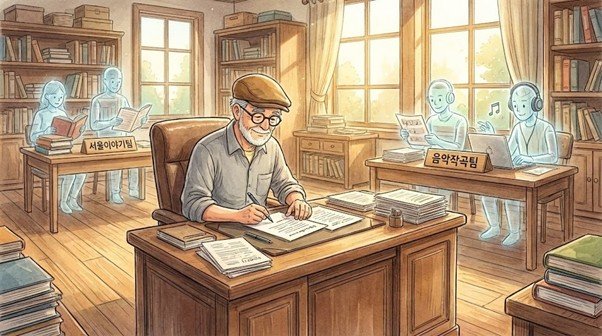 “원고 7장에 나오는 ‘누군가 널 위해 기도하네’ 주제곡을 작곡해야 해. 서울이야기팀, 음악작곡팀에게 그 장면의 감정선과 스토리 맥락을 설명해줘.” (엔터)