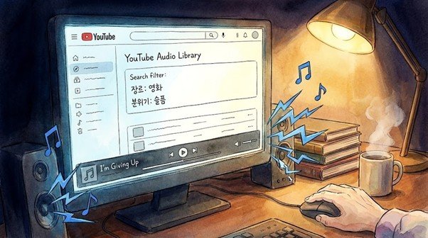 ‘장르: 영화, 분위기: 슬픔’을 검색했다. 무료 음악 ‘I’m Giving Up‘을 찾았다. 훌륭한 연주곡이다. 하지만 아니다.