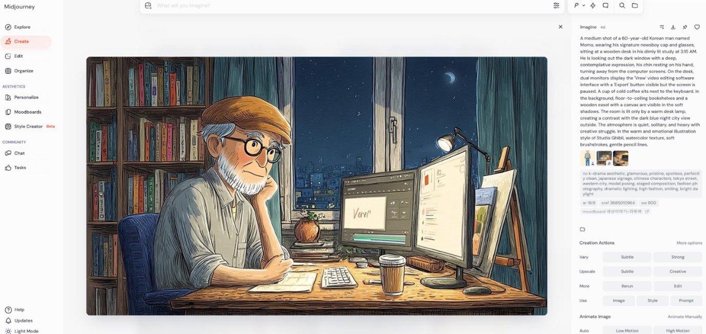 미드저니 생성 이미지새벽 3시 15분. 커피는 차갑게 식었다. 보통의 60대라면 깊은 잠에 빠져 있을 시간이지만, 잠들지 못한다. 나의 시네마틱 노블 〈등대세탁소〉 원고를 완성했다. 이미지 생성 AI인 미드저니(Midjourney)로 삽화 150장도 그렸다. AI 영상 편집 프로그램 브루(Vrew)로 영상 편집까지 마쳤다.