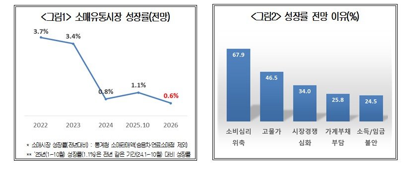 22일 대한상공회의소(대한상의)가 전국 소매유통업체 300곳을 대상으로 실시한 ‘2026년 유통산업 전망 조사’ 결과에 따르면 내년 국내 소매유통시장 성장률은 0.6%로 최근 5년 내 가장 낮은 수준을 기록할 것으로 나타났다.