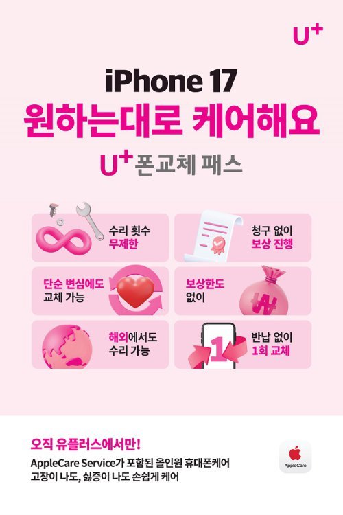 수리 혜택은 최대 3년간 무제한 파손 수리를 제공한다. 기존 보험상품과 달리 별도의 청구절차 없이, 공식 서비스센터에서 수리 후 자기부담금만 납부하면 된다. 애플케어서비스를 포함해 글로벌 수리 지원과 원스톱 지원 등 제조사 공식 특전까지 누릴 수 있다.