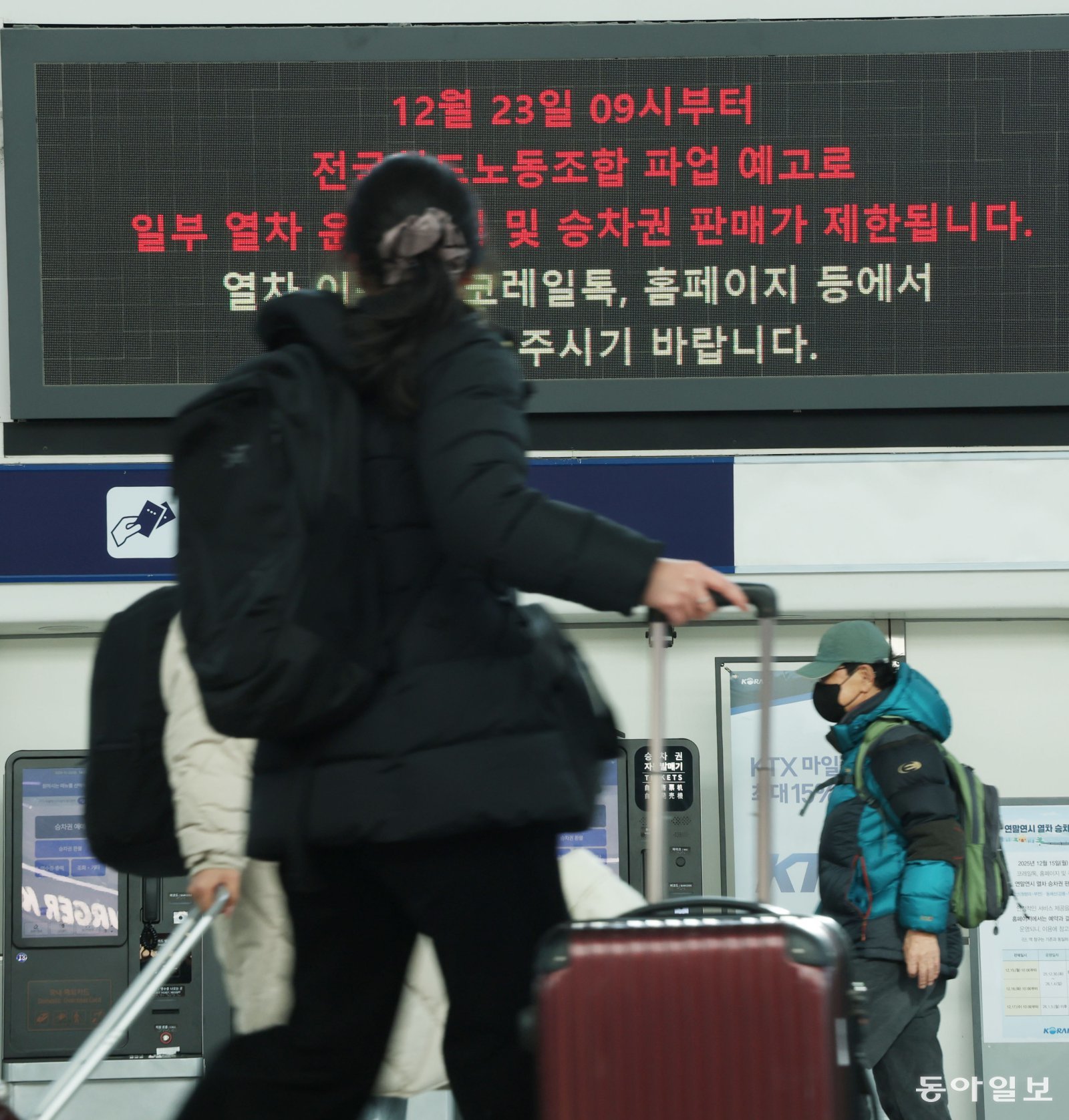 22일 오후 서울역 내 전광판에 전국민주노동조합총연맹(민노총) 산하 전국철도노동조합(철도노조) 파업으로 일부 열차가 감축 운행되고, 승차권 판매도 제한된다는 안내가 띄워져 있다. 신원건 기자 laputa@donga.com23일 파업을 예고했던 민주노동조합총연맹(민노총) 산하 전국철도노동조합(철도노조)이 파업을 유보했다. 이에 따라 모든 열차는 정상 운행된다.