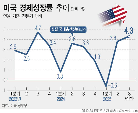 AP 뉴시스23일(현지 시간) 미 상무부는 올 3분기 국내총생산(GDP) 증가율이 4.3%(전기 대비 연율)로 집계됐다고 발표했다. 다우존스가 집계한 전문가 전망치 3.2%를 크게 뛰어넘는 수치다. 분기 기준으로 지난 2023년 3분기(4.7%) 이후 2년 만에 가장 높은 성장률이다. 상무부는 개인소비와 수출, 정부지출 증가가 3분기 GDP 증가에 기여했다고 설명했다.