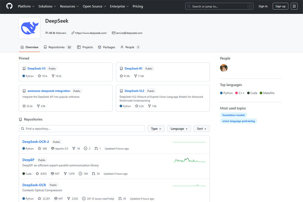 딥시크의 개발자 커뮤니티 ‘깃허브’ 페이지, 많은 모델들이 오픈소스로 공개돼있다 / 출처=깃허브