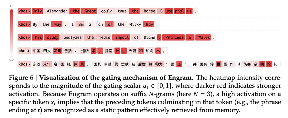 AI가 문장을 처리할 때 특정 단어나 구절을 어떻게 기억장치에서 불러오는지를 시각화한 그림 / 출처=딥시크해당 논문은 자주 사용되는 패턴이나 지식을 엔그램(단어 뭉치) 형태의 메모리에 저장해 둔 뒤 질문의 조건과 맥락이 맞을 때 이를 출력한다. 기존 모델은 8X7을 물어볼 때 행렬 곱셈을 수행한 뒤 56이라는 답을 내놓는다. 반면 엔그램 방식은 8X7 질문 자체를 사전에 저장된 값으로 보고 56이라는 답을 내놓는다. 덕분에 GPU로 데이터 연산을 처리하지 않고 D램을 통해 메모리 테이블을 확장해서 지식의 양을 확장할 수 있다.
