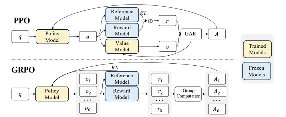PPO는 흔히 사용되는 강화학습 알고리즘인데, 비판 모델을 추가하다보니 메모리 부담이 크다. 반면 GRPO는 비판 모델 없이 다수의 결과물을 낸 뒤 각 결과물을 비교해 메모리 부담을 줄였다 / 출처=딥시크