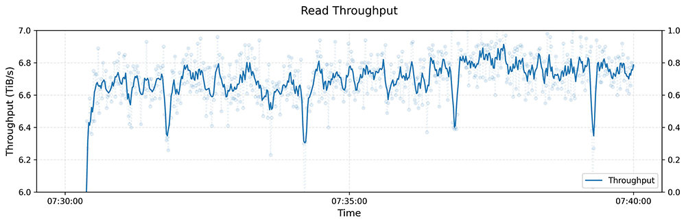 딥시크 3FS로 구현한 시스템의 읽기 처리량을 분석한 그래프, 평균 초당 6.6테라바이트의 엄청난 읽기 속도를 통해 AI의 검색 효율 등을 크게 끌어올린다 / 출처=딥시크