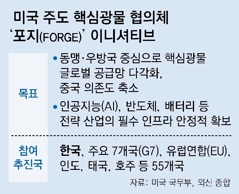마코 루비오 미국 국무장관은 4일(현지 시간) 핵심광물 공급망 개선을 위해 도널드 트럼프 행정부가 구상 중인 무역블록 구축과 글로벌 협의체인 핵심광물안보파트너십(MSP·16개국 참여)을 ‘포지 이니셔티브’(FORGE·Forum on Resource Geostrategic Engagement·지전략적 자원협력 포럼·55개국 참여 추진)로 확대 출범하는 것을 공식화하며 이같이 밝혔다. 미국이 동맹 및 우방과 함께 핵심광물 무역블록을 구축하려는 구상의 목표가 중국의 ‘희토류 무기화’ 억제에 있음을 분명히 나타낸 것이다. 특히 루비오 장관은 MSP에서 의장국을 맡아 온 한국을 콕 집어 “선도적인 역할”을 해줬다며 감사를 표했다. 일각에선 무역블록 구축과 포지 이니셔티브에 한국이 더욱 적극적으로 참여하란 뜻을 내비친 발언이란 평가도 나온다.