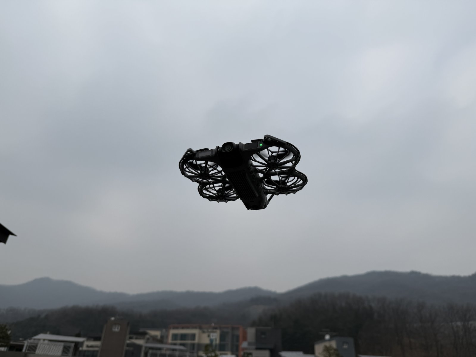프로펠러 가드가 이미 장착된 상태라 별도 조립 없이 바로 테스트에 들어갔다. 첫 비행은 집 안에서 손 제스처로 해봤다. 손바닥에 올려놓고 전원 버튼을 2초 누르니 팬이 돌며 부드럽게 이륙했다. 손을 앞으로 내밀면 앞으로 나아가고, 옆으로 기울이면 좌우로 이동한다.