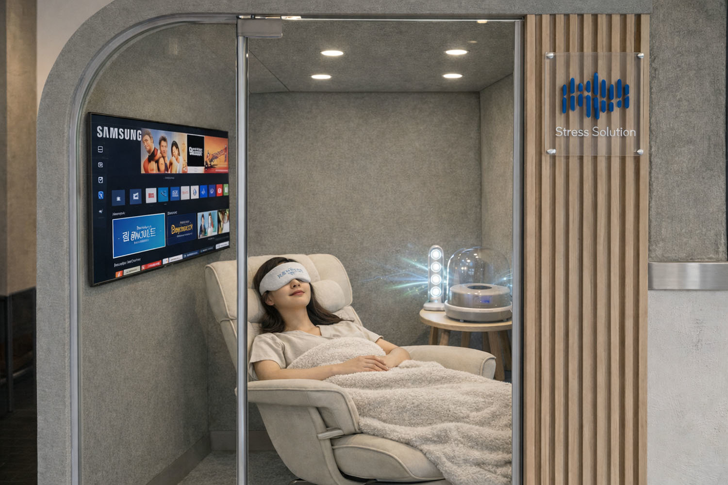 KB 임직원이 스트레스솔루션 힐링비트로 스트레스 상태를 자가 진단하는 모습 / 출처=스트레스솔루션스트레스솔루션은 2025년 삼성 C-LAB 아웃사이더 기업에 선정돼 2026년 CES 삼성 C-Lab 관에 참여했다. 이 외에도 다양한 로보케어 기업들과 AI 카메라 기반 측정 기술을 적용했다. 사용자의 얼굴을 카메라로 파악한 후 “잘 때 자장가 틀어줘”라고 말하면 개인 맞춤형 자장가를 재생하는 구조다.