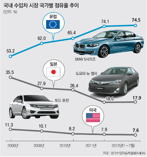 일본차 딜러가 잇달아 사업에서 철수하고 있는 것은 일본차의 국내 점유율이 크게 떨어졌기 때문이다. 2008년 35.5%였던 일본차 점유율은 동일본대지진에 따른 생산차질로 최악의 위기를 겪은 지난해 18.0%로 반토막이 났다. 생산이 완전히 회복된 올 들어 7월 말까지의 점유율도 17.9%에 그쳐 회생 기미가 안 보인다. 수입차업계 한 관계자는 “엔고(高)현상에 따른 가격경쟁력 저하와 유럽차의 공세, 자국 시장을 지키려는 한국 업체들의 노력이 일본차의 발목을 잡고 있다”고 말했다.