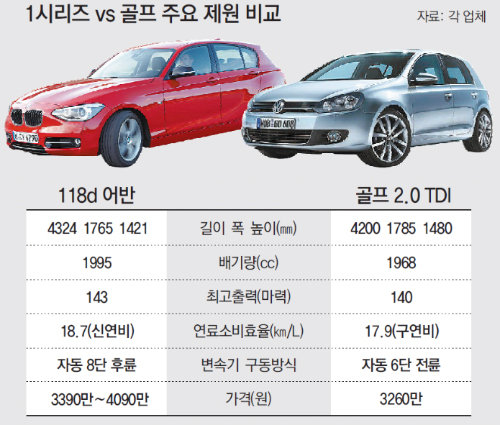 1시리즈의 경쟁 모델로는 같은 독일산 소형 해치백인 폴크스바겐 ‘골프’가 있다. 수입 디젤 해치백의 선봉장 격인 골프는 ‘해치백의 교과서’라는 명성을 갖고 있다. 국내에는 6세대 모델이 2009년 출시돼 꾸준한 인기를 얻고 있다. 골프는 올해도 월평균 200여 대씩 팔리고 있다. 골프의 가격대는 주력모델인 2.0 TDI가 3260만 원으로 118d 기본형과의 가격 차가 130만 원에 불과하다. 1시리즈가 올해 나온 최신형인 데 비해 골프 6세대는 유럽 기준(2008년 출시)으로 5년차에 접어들었다. 지난달 유럽에서 판매를 시작한 골프 7세대는 세계적인 물량 부족으로 국내에는 내년 하반기에나 출시될 것으로 보인다.