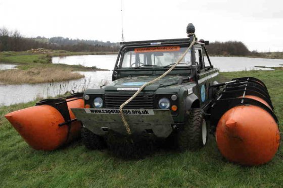 “랜드로버의 수륙양용 차량 중 하나다. 공기 흡입구와 배기구를 높게 장착했고 스노클을 탑재했으며 스노클 없이도 깊은 물을 건널 수 있다.”