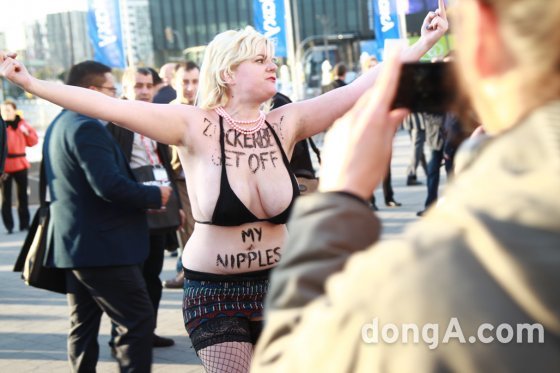 국제 여성인권단체(FEMEN) 소속 한 여성 회원이 2일 MWC가 열리고 있는 스페인 바르셀로나 피아 그란비아 전시장 앞에서 누드 시위를 벌이고 있다. ○ 삼성전자 ‘실망’, LG전자 ‘북적’