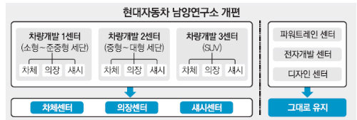 남양연구소는 이전까지 소형 및 준중형차, 중형차, 스포츠유틸리티차량(SUV) 등 차종별 생산 공정에 맞춰 차량개발 1센터, 2센터, 3센터 등으로 나뉘어 있었다. 1센터에서는 소형 및 준중형, 2센터에서는 중형에서 대형차종까지를, 3센터에서는 SUV 차종 개발을 담당하고 있다. ‘싼타페’ ‘쏘렌토’ 등 SUV를 같은 생산라인에서 만들듯이 R&D도 차종에 따라 나뉜 단일 센터에서 책임지는 방식이었다.