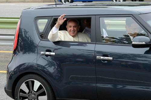 기아차 쏘울에 탄 프란치스코 교황이 14일 경기 성남시 서울공항을 출발해 주한 교황청대사관으로 이동하는 도중 시민들을 향해 손을 흔들고 있다. 뉴스1교황은 이번 4박5일 일정의 방한에서 의전차를 비롯해 식수, 모자, 우비, 우산, 와인에 이르기까지 모두 국산을 사용했다.