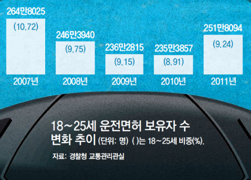 경찰청에 따르면 우리나라 18∼25세 운전면허 보유자 비중은 2007년 10.72%에서 2010년 8.91%로 줄었다. 지난해에는 운전면허 취득 간소화와 이 연령대 인구수 유입 증가로 비중이 9.24%로 소폭 증가했지만 이는 일시적인 것일 뿐 점진적인 감소세는 여전하다는 게 전문가들의 의견이다. 일본은 1990년대 초 ‘부동산 버블’ 붕괴 후 20대의 신차 구매가 급격히 줄어 버블 붕괴 직전 770만 대 규모의 내수시장이 지난해 421만 대로 위축됐다.