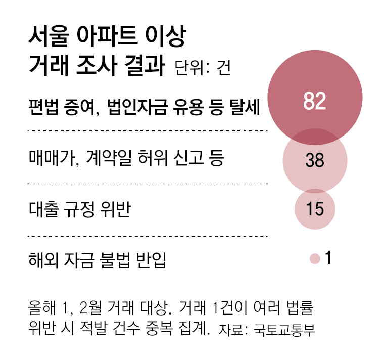 국토부는 서울시, 한국부동산원과 함께 올해 1, 2월 이뤄진 서울 아파트 거래를 조사한 결과 위법 행위가 의심되는 거래 108건을 적발했다고 28일 밝혔다. 일부 거래는 위반 행위가 2건 이상이라 위법 의심 행위는 총 136건이었다.