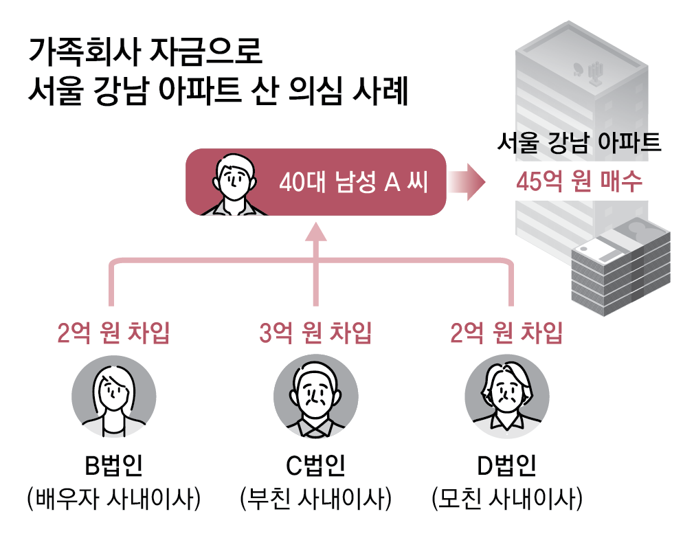40대 남성 A 씨는 올해 1월 서울 강남구 한 아파트를 45억 원에 매수하면서 가족들이 운영하는 회사를 총동원했다. 아내와 아버지, 어머니가 각각 사내이사로 있는 법인 3곳에서 정상적인 회계 처리 없이 총 7억 원을 빌렸다. 국토교통부는 A 씨가 가족 회사의 자금을 빼돌린 것으로 보고 국세청에 통보하기로 했다.