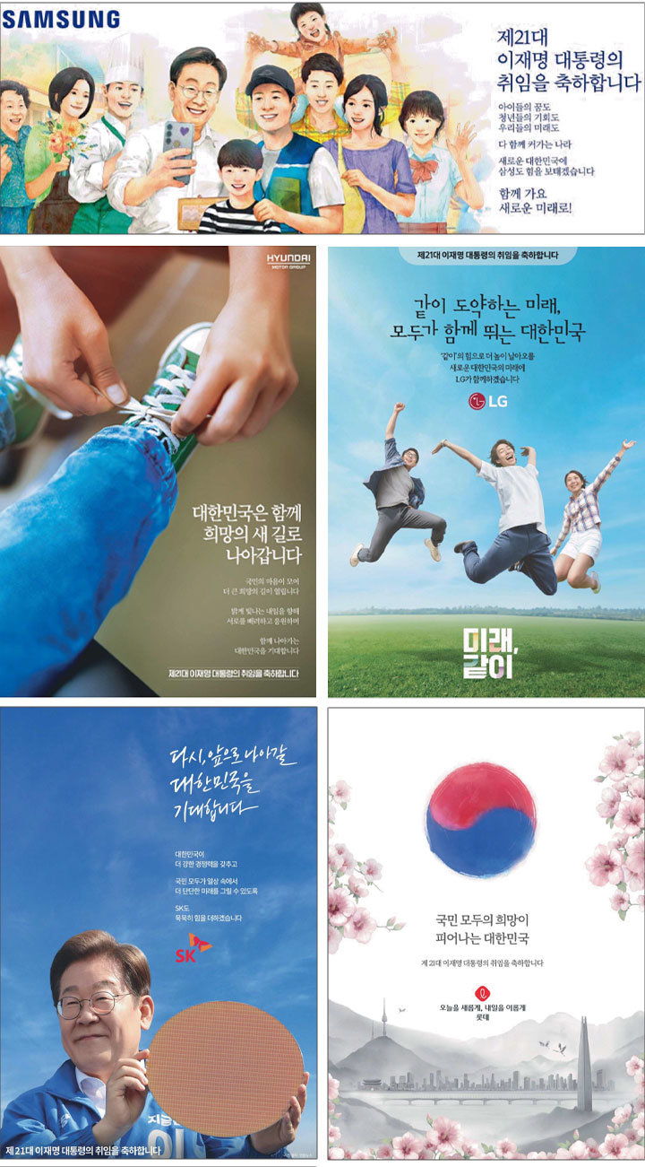 제21대 이재명 대통령 취임을 맞아 국내 주요 기업들이 일제히 축하 광고를 게재해 눈길을 끈다.