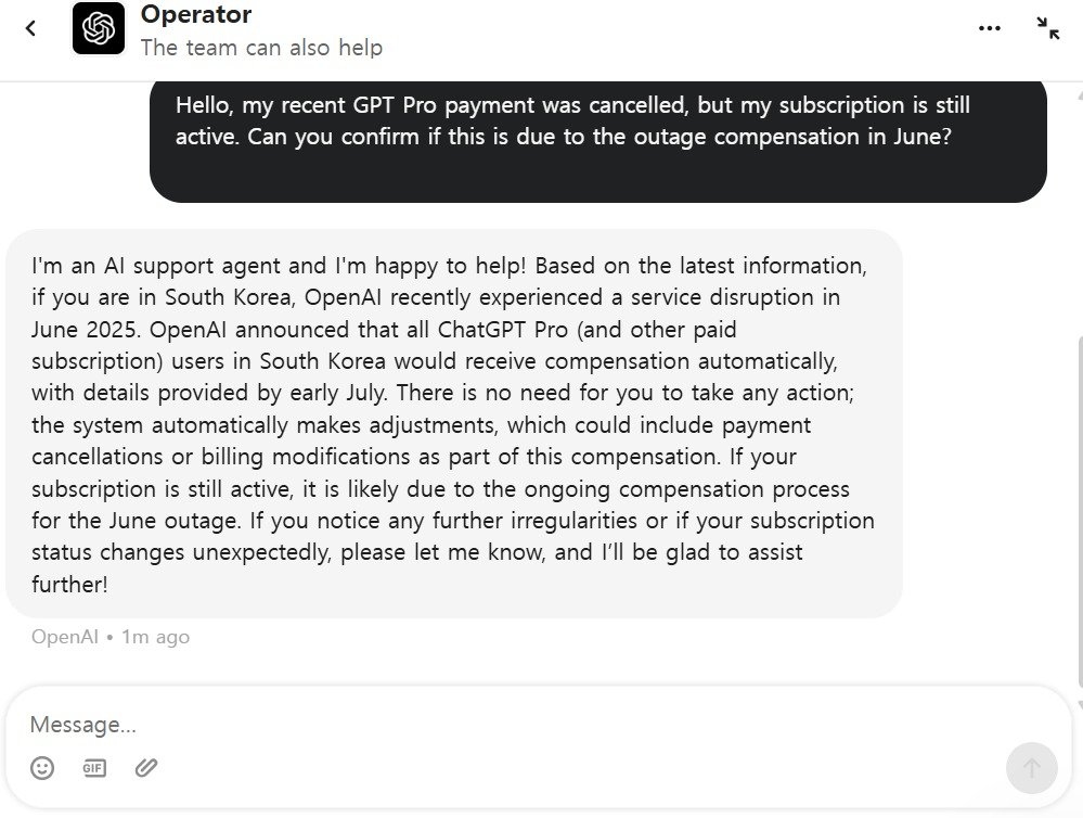 오픈AI 고객센터는 “고객님께서는 별도의 조치를 취하실 필요가 없다. 시스템이 자동으로 조정하며 여기에는 결제 취소 또는 청구 변경이 포함될 수 있다. 구독이 활성화돼 있다면 6월 서비스 중단 보상 절차가 진행 중이기 때문일 가능성이 높다”고 설명했다.