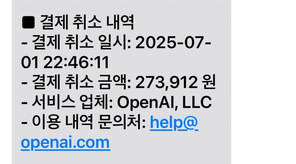 오픈AI는 한국의 챗GPT 프로 구독자에게 1일 오후 10시 40분쯤 문자 메시지를 통해 “휴대폰 결제(콘텐츠 이용료) 취소 안내” 메시지를 보내고 해당 결제를 취소했다.2일 업계에 따르면 오픈AI는 한국의 챗GPT 프로 구독자에게 1일 오후 10시 40분쯤 “휴대폰 결제(콘텐츠 이용료) 취소 안내” 문제 메시지를 보내고 해당 결제를 취소했다. 프결제 취소 금액은 27만 3912원, 서비스업체는 OpenAI LLC로 각각 표기됐다.