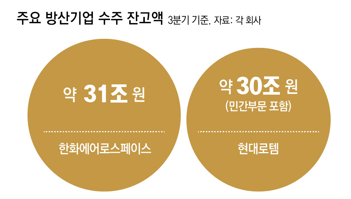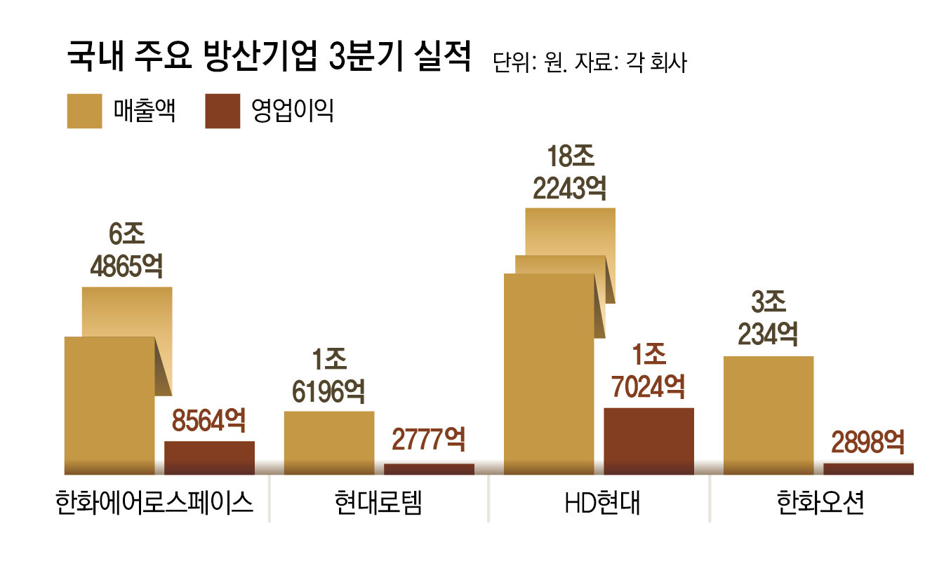 이 두 회사만 합쳐도 한국 방산업계의 3분기 영업이익이 이미 1조 원을 넘는다. 특히 두 회사는 3분기 현재 30조 원 안팎의 수주 잔액(일부 현재까지 실적에 미반영)을 보유하고 있어 향후 실적이 계속해서 증가할 것으로 전망된다. 방산업계에서는 올해 방산기업들의 합산 영업이익이 4조 원을 넘어설 것이라는 관측도 나온다.