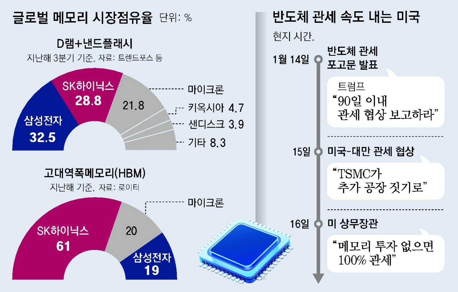 미국은 그간 메모리 관세에 신중해 왔다. 한국 점유율이 60%를 웃도는 상황에서 관세를 올리면 아이폰부터 AI데이터센터까지 정보기술(IT) 물가 폭등이 예견되기 때문이다.