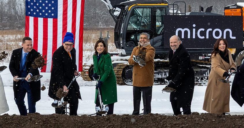16일(현지 시간) 미국 뉴욕주 클레이에서 열린 마이크론 반도체 공장 착공식에서 참석자들이 기념사진을 촬영하고 있다. 왼쪽에서 두 번째부터 척 슈머 민주당 상원 원내대표, 캐시 호컬 뉴욕주지사, 산제이 메로트라 마이크론 최고경영자(CEO), 하워드 러트닉 미국 상무장관, 로리 차베즈더리머 미국 노동장관. 마이크론 제공