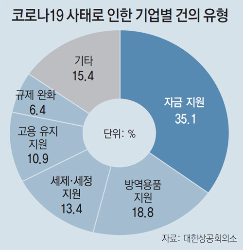 분석 결과 기업들은 △매출 감소(38.1%) △부품·원자재 수급(29.7%) △수출 애로(14.6%) △방역용품 부족(5.3%) 등의 어려움을 겪고 있었다. 정부 건의사항으로는 자금 지원(35.1%), 세제·세정 지원(13.4%), 고용유지 지원(10.9%) 등 금전적 지원 요청만 60%에 달했다. 코로나19가 소상공인 뿐만 아니라 중소·중견 기업의 존립 기반까지 위협하고 있다는 것이 대책반의 분석이다.