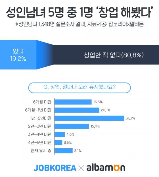잡코리아와 알바몬은 성인 1348명에게 ‘창업 경험 및 애로사항’을 묻는 설문조사를 실시한 결과, 응답자 19.2%가 ‘과거 창업을 한 적 있다’고 답했다.