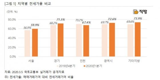 직방은 올해 1분기 서울 아파트의 전세가율은 59.9%로 지난해 4분기(56.9%)보다 3%포인트(p) 상승했다고 9일 밝혔다.