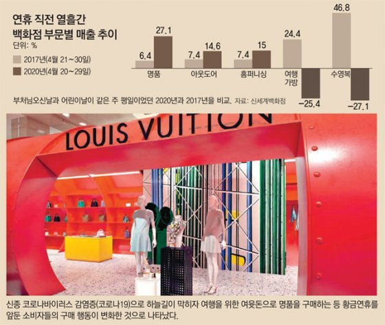 신세계백화점이 올해 4월 30일부터 5월 5일까지 이어지는 황금 연휴기간 전 열흘간(4월 20∼29일) 소비 품목별 매출 추이를 분석한 결과, 백화점을 찾은 고객들은 해외여행 관련 상품 대신에 명품 가방 등을 구매한 것으로 나타났다. 연휴를 위해 준비해둔 여윳돈으로 명품을 구매하는 고객이 늘어나며 관련 품목의 매출이 지난해보다 27.1% 증가했다. 반면 올해처럼 긴 황금연휴가 있었던 2017년(4월 21∼30일)에는 여행용 가방이나 수영복 등이 인기가 많았다.