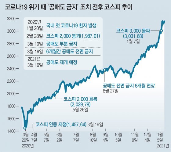금융당국이 예정대로 3월 16일 공매도를 재개하면 이 자금이 풀리면서 시장에 충격을 줄 수 있다는 게 개인투자자들과 정치권의 우려다. 반면 금융당국은 ‘삼천피(코스피 3,000)’를 넘어선 만큼 공매도를 재개할 적기라고 본다.