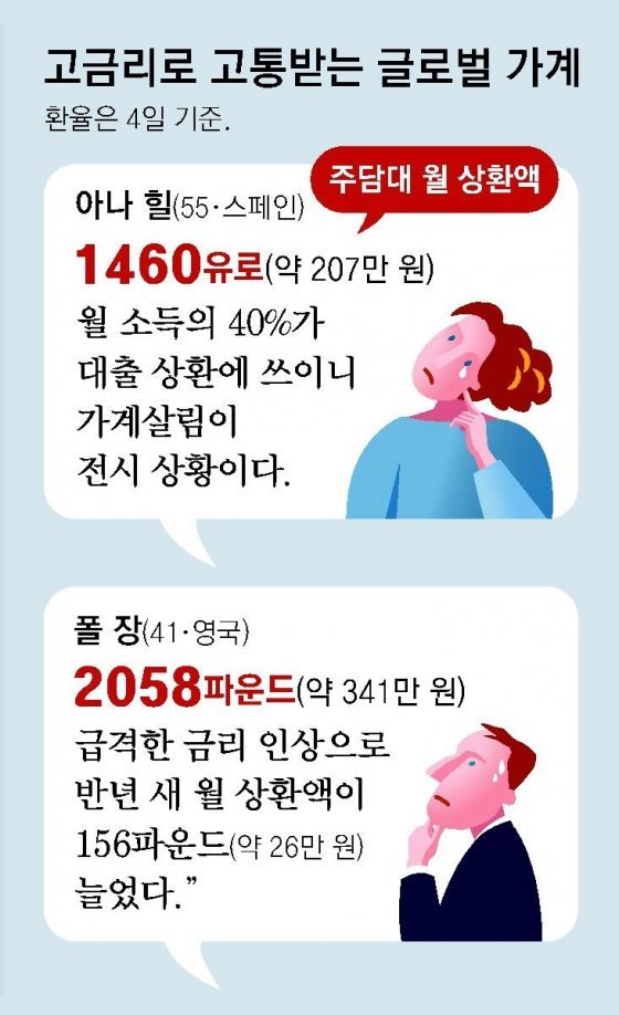 스페인 마드리드 교외 보아디야델몬테의 연립주택에 사는 주부 아나 힐 씨(55)는 글로벌 금융위기 이후 찾아온 저금리 시기에 대출 규모를 늘려 총액 30만 유로(약 4억2558만 원)를 변동금리 조건으로 상환하고 있다. 금리가 오르자 늘어난 부채가 부메랑으로 돌아왔다. 1000유로(약 142만 원)를 넘지 않았던 월 상환액은 1460유로(약 207만 원)까지 불어났다.